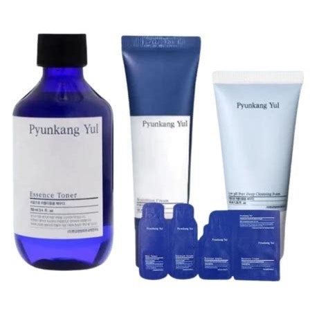 الصورة تحتوي على مجموعة من منتجات العلامة الكورية Pyunkang Yul، وهي معروفة بتركيباتها البسيطة والمناسبة للبشرة الحساسة. المنتجات الظاهرة تشمل: 1. Pyunkang Yul Essence Toner – التونر الشهير في العبوة الزرقاء الداكنة، غني بالـ Astragalus Root Extract، ممتاز للترطيب وتهدئة البشرة. 2. Pyunkang Yul Low pH Pore Deep Cleansing Foam – غسول بتركيبة خفيفة بحمضية متوازنة (pH منخفض) يساعد على تنظيف المسامات بدون تجفيف البشرة. 3. Pyunkang Yul Moisture Cream أو ATO Cream (صعب التمييز من العبوة، لكنهما متشابهان) – مرطب لطيف مناسب للبشرة الحساسة والجافة. 4. عينات تجريبية من منتجات متنوعة. 5. حقيبة قماش بشعار العلامة